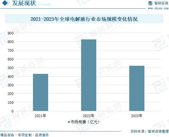 電解液是鋰離子電池的四大主要組成部分之一,是實現鋰離子在正負極遷移的媒介,對鋰電容量、工作溫度、循環效率以及安全性都有重要影響。2022年全球電解液市場規模達到824.20億元,同比增長92.39%。統計數據顯示,2023年全球電解液市場規模為522.1億元,同比下滑36.7%,主要原因在于電解液價格的下滑。