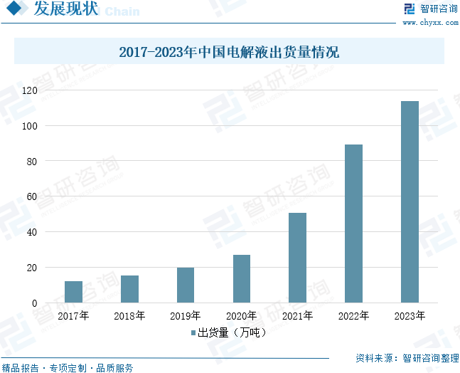 通常電解液占電池重量和體積的比重分別為15%、32%,其對純度及雜質的含量要求非常高,生產過程中需要高純的原料以及必要的提純工藝。2017年至2022年全球電解液出貨量由16.7萬噸增長至104.3萬噸,2023年全球電解液出貨量約為131.26萬噸。