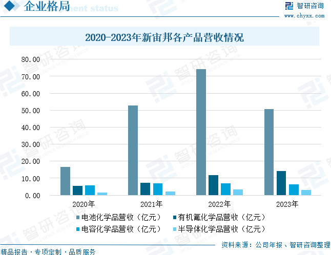 深圳新宙邦科技股份有限公司主營業務是新型電子化學品及功能材料的研發、生產、銷售和服務,主要產品包括電池化學品、有機氟化學品、電容化學品、半導體化學品四大系列。公司通過自主研發、產學研合作和上下游協同等方式,開展產品與技術創新,為客戶提供高品質的產品和解決方案,并通過前沿研究持續培育公司新增長點。經過多年發展,公司掌握了鋰離子電池電解液及相關材料的核心生產技術,能生產高質量產品,為客戶提供全方位、多元化的服務,在行業中享有較高的市場地位,與行業主要頭部客戶均建立了長期穩定的合作關系。數據顯示,2023年新宙邦電池化學品營收為50.53億元;有機氟化學品營收為14.25億元;電容化學品營收為6.29億元;半導體化學品營收為3.11億元。