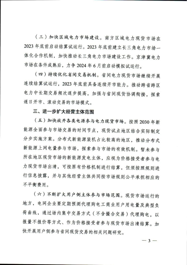 通知提出,加快放開各類電源參與電力現(xiàn)貨市場。按照2030年新能源全面參與市場交易的時間節(jié)點,現(xiàn)貨試點地區(qū)結(jié)合實際制定分步實施方案。分布式新能源裝機占比較高的地區(qū),推動分布式新能源上網(wǎng)電量參與市場,探索參與市場的有效機制。暫未參與所在地區(qū)現(xiàn)貨市場的新能源發(fā)電主體,應視為價格接受者參與電力現(xiàn)貨市場出清,可按原有價格機制進行結(jié)算,但須按照規(guī)則進行信息披露,并與其他經(jīng)營主體共同按市場規(guī)則公平承擔相應的不平衡費用。