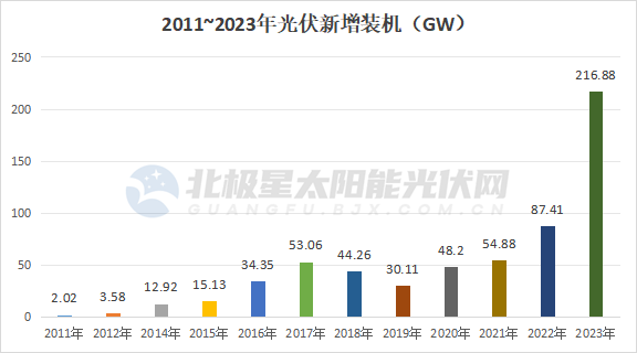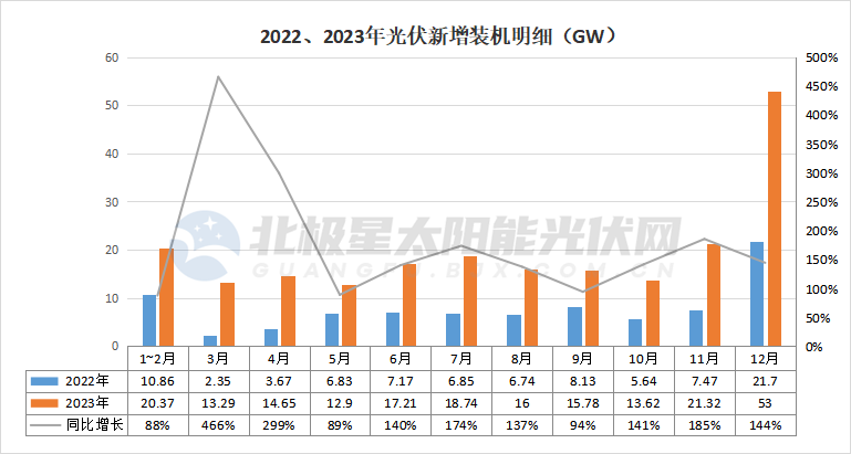 截至12月底,全國累計發電裝機容量約29.2億千瓦,同比增長13.9%。其中,太陽能發電裝機容量約6.1億千瓦,同比增長55.2%;風電裝機容量約4.4億千瓦,同比增長20.7%。根據國家能源局發布的2022年全國電力工業統計數據來看,2023年全年,光伏新增裝機216.88GW,其中12月新增裝機53GW,同比增長144%。