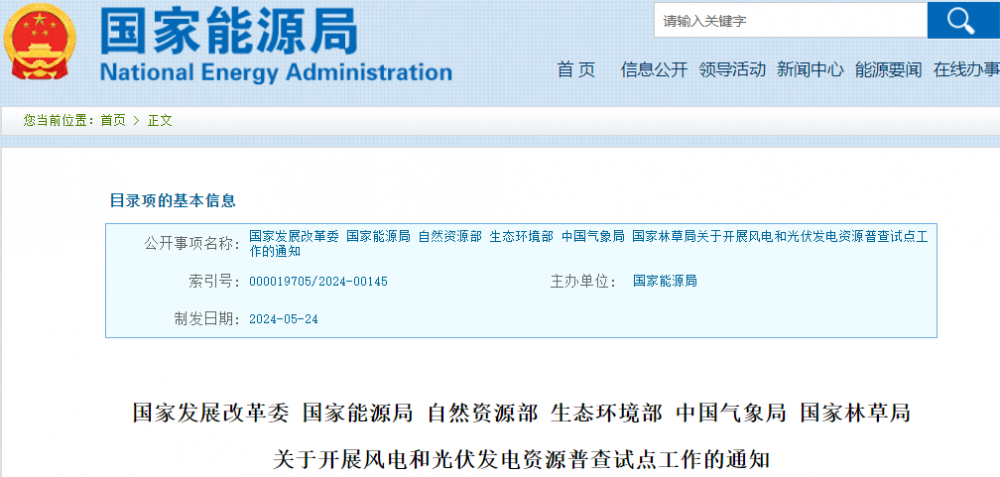 6月6日,國家發展改革委 國家能源局 自然資源部 生態環境部 中國氣象局 國家林草局發布《關于開展風電和光伏發電資源普查試點工作的通知》。