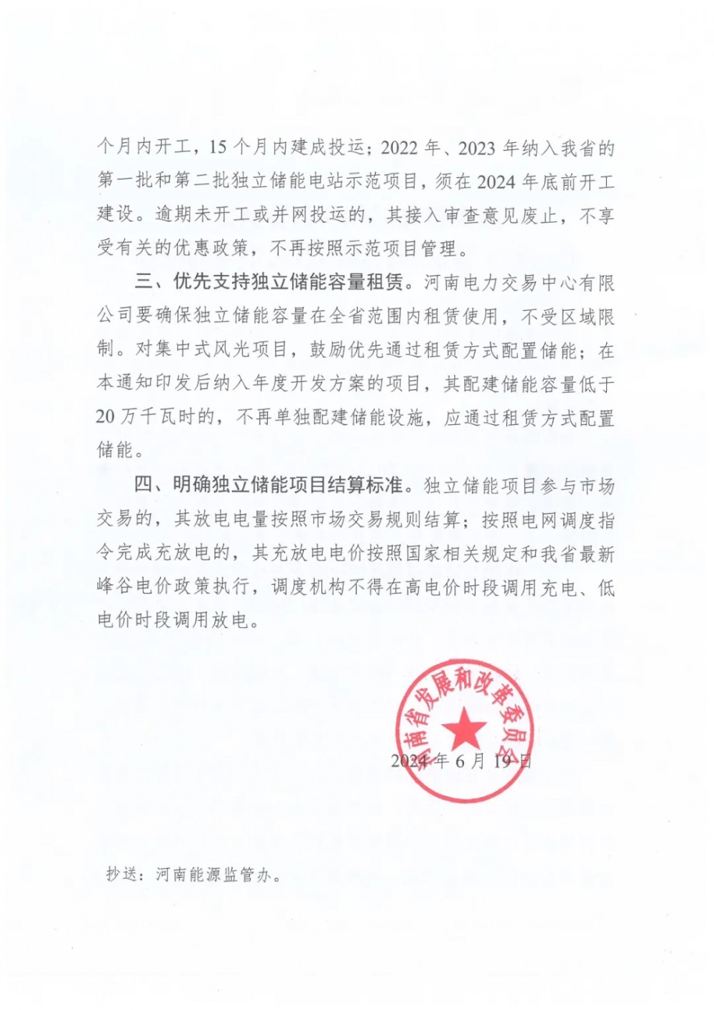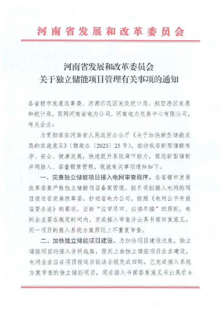 6月19日,河南省發(fā)展和改革委員會(huì)正式發(fā)布《關(guān)于獨(dú)立儲(chǔ)能項(xiàng)目管理有關(guān)事項(xiàng)的通知》,通知指出,已完成接入系統(tǒng)方案審查的獨(dú)立儲(chǔ)能項(xiàng)目,須在接入書面答復(fù)意見(jiàn)書出具后6個(gè)月內(nèi)開(kāi)工,15 個(gè)月內(nèi)建成投運(yùn);2022年、2023年納入河南省的第一批和第二批獨(dú)立儲(chǔ)能電站示范項(xiàng)目,須在2024年底前開(kāi)工建設(shè)。逾期未開(kāi)工或并網(wǎng)投運(yùn)的,其接入審查意見(jiàn)廢止,不享受有關(guān)的優(yōu)惠政策,不再按照示范項(xiàng)目管理。