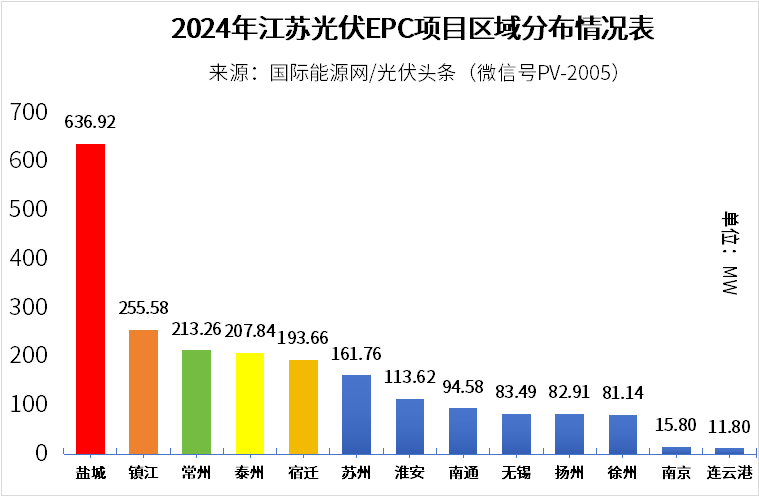 從地市分布情況來看,鹽城以636.92MW高居榜首,鎮江以255.58MW排名第二,常州以213.26排名第三。