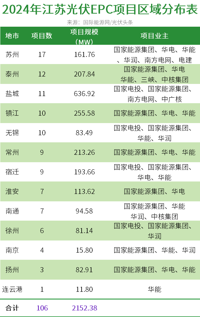 國際能源網/光伏頭條(PV-2005)統計,2024年上半年,江蘇有108個光伏EPC項目定標,合計容量2702.38MW。
