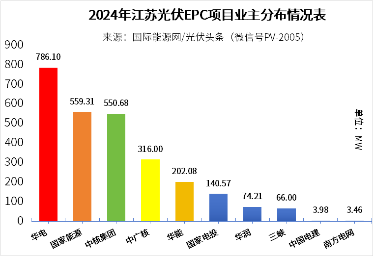 江蘇光伏EPC市場參與者眾多,但央國企依然是開發主體。其中,五大發電集團占據絕對主導地位。