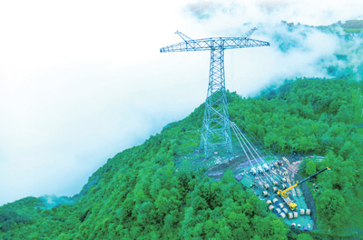 國家電網白鶴灘至浙江±800千伏特高壓輸電工程四川段放線現場。