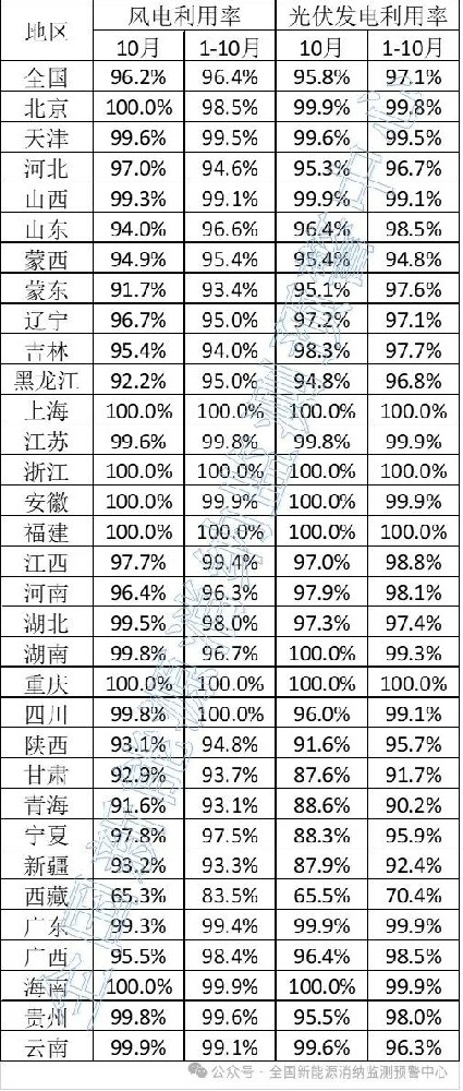 11月29日,全國新能源消納監(jiān)測預(yù)警中心公布10月各省級區(qū)域新能源并網(wǎng)消納情況,10月光伏發(fā)電利用率光伏96.2%,風(fēng)電95.8%。
