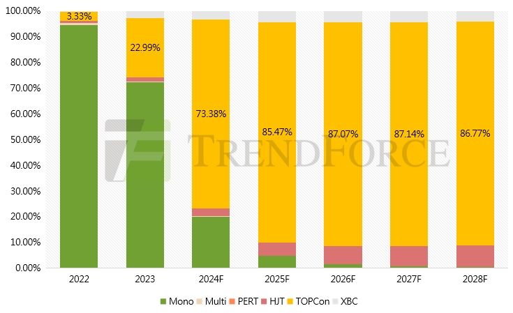 圖:2022-2029年不同類型電池片產出占比趨勢