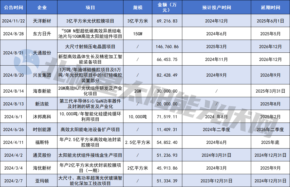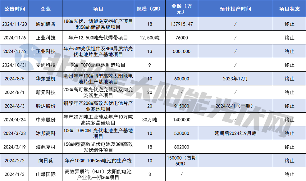 北極星統(tǒng)計(jì),2024年以來(lái)宣布延期、終止項(xiàng)目總投資額超過(guò)600億元。具體來(lái)看,共14家企業(yè)宣布延期項(xiàng)目,幾乎涵蓋光伏全產(chǎn)業(yè)鏈,項(xiàng)目延期投產(chǎn)時(shí)間多集中在2025、2026年;而12個(gè)終止項(xiàng)目則主要集中于電池、組件環(huán)節(jié),且多為跨界玩家,所瞄準(zhǔn)的也都是高效N型技術(shù)。
