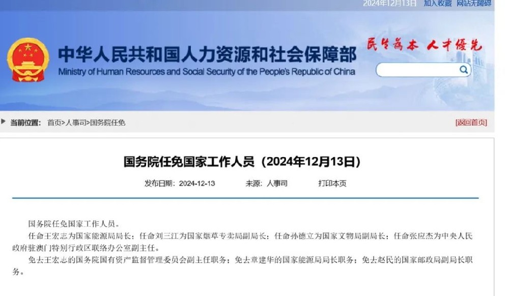 據人社部網站12月13日消息,國務院任免國家工作人員。其中,任命王宏志為國家能源局局長,免去章建華的國家能源局局長職務。