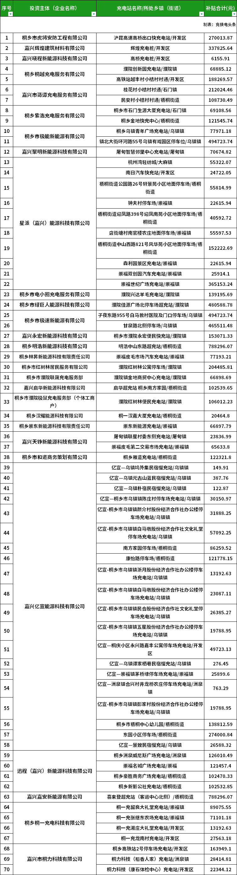根據2024年度第二批新能源汽車充電基礎設施獎勵資金二次公示名單顯示,桐鄉市虎將安防工程有限公司、嘉興輝煌建筑材料有限公司、嘉興曉程新能源科技有限公司、桐鄉桐越充電服務有限公司、嘉興市哥譚充電服務有限公司、桐鄉紫浩充電服務有限公司、桐鄉市極能新能源有限公司、嘉興聚明新能源科技有限公司、星派(嘉興)能源科技有限公司、桐鄉市電小圈充電服務有限公司、桐鄉市綠巨人能源科技有限公司等44家企業,125座充電站獲獎補資金。
